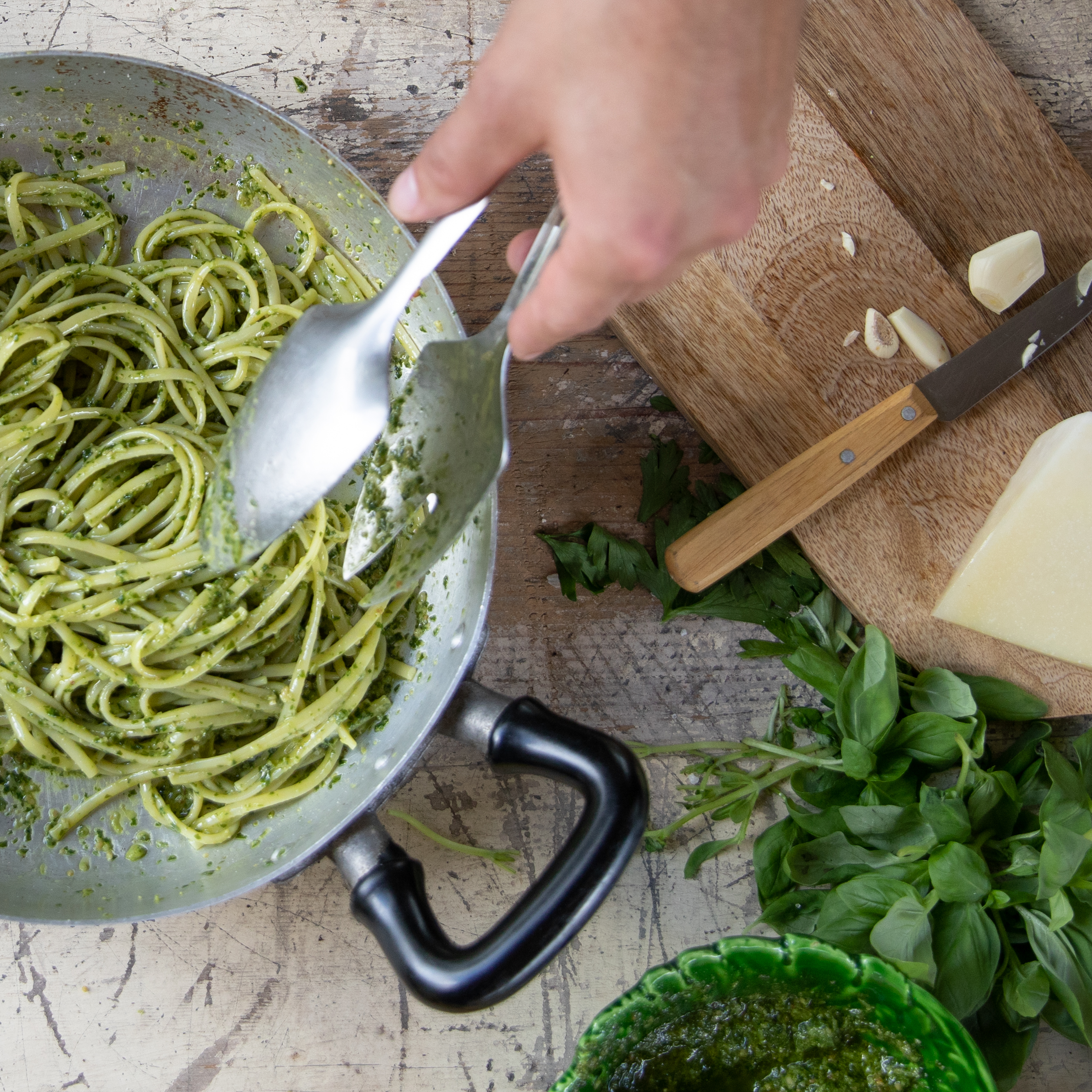 - When ready, remove the pasta from the pan with water, save some cooking liquid and put it in a frying pan. Add the pesto (keep a little left for presentation) and stir it into the pasta. Buon apetito!