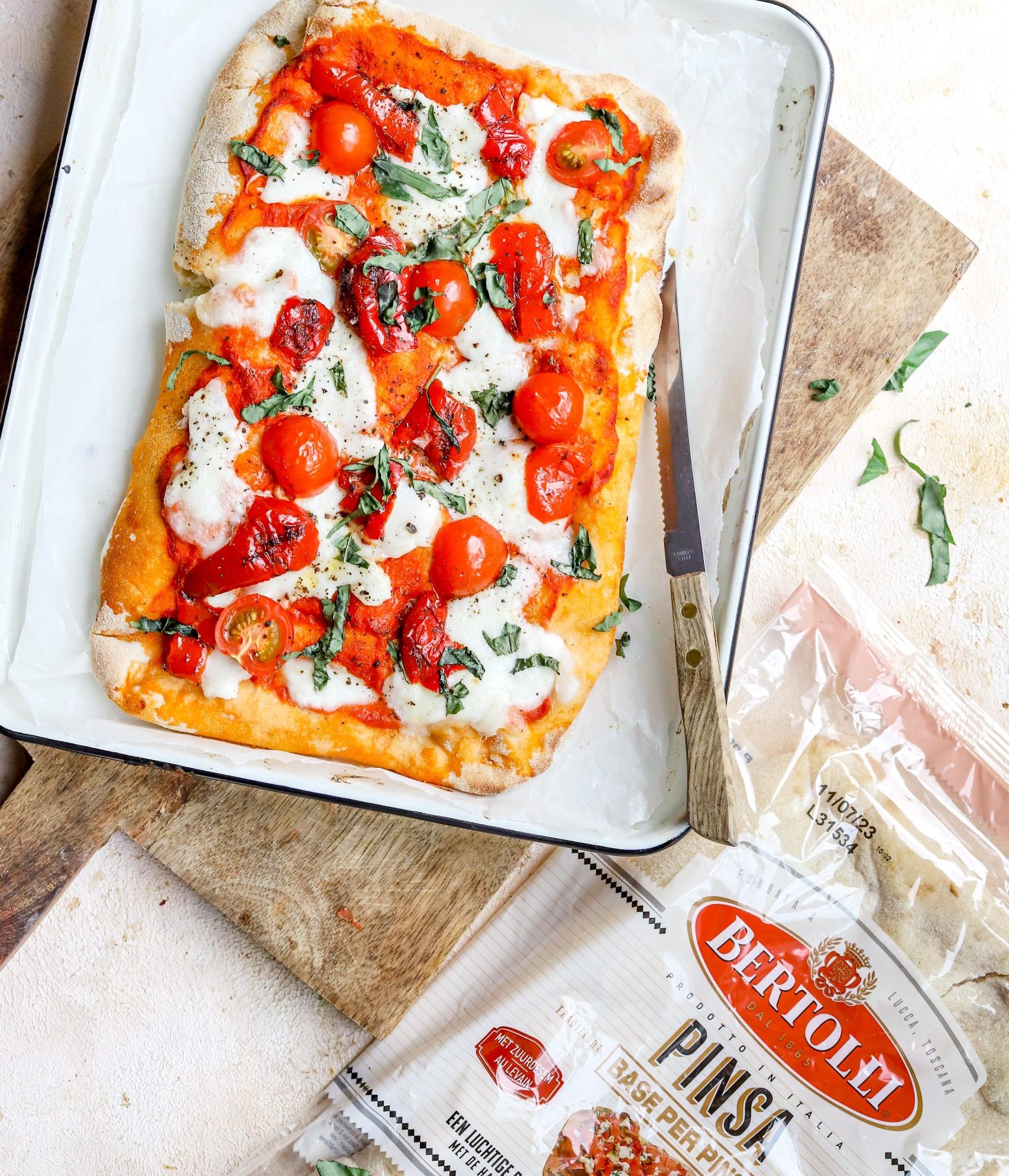 - Top the pinsa with the Bertolli originale (or piccante) pizza sauce, mozzarella, pepper, salt, grilled peppers, tomatoes and the fresh basil.