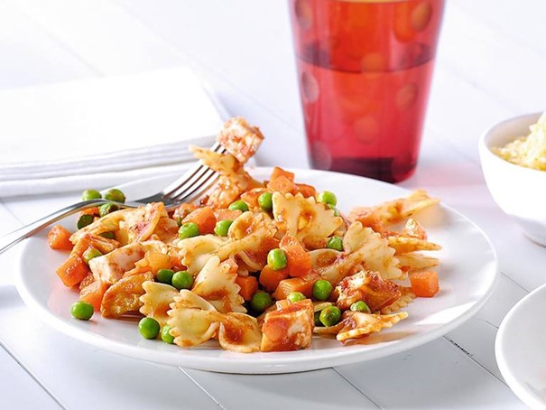 Een heerlijk pastagerecht! Farfalle met doperwtjes, wortel en gerookte kip.