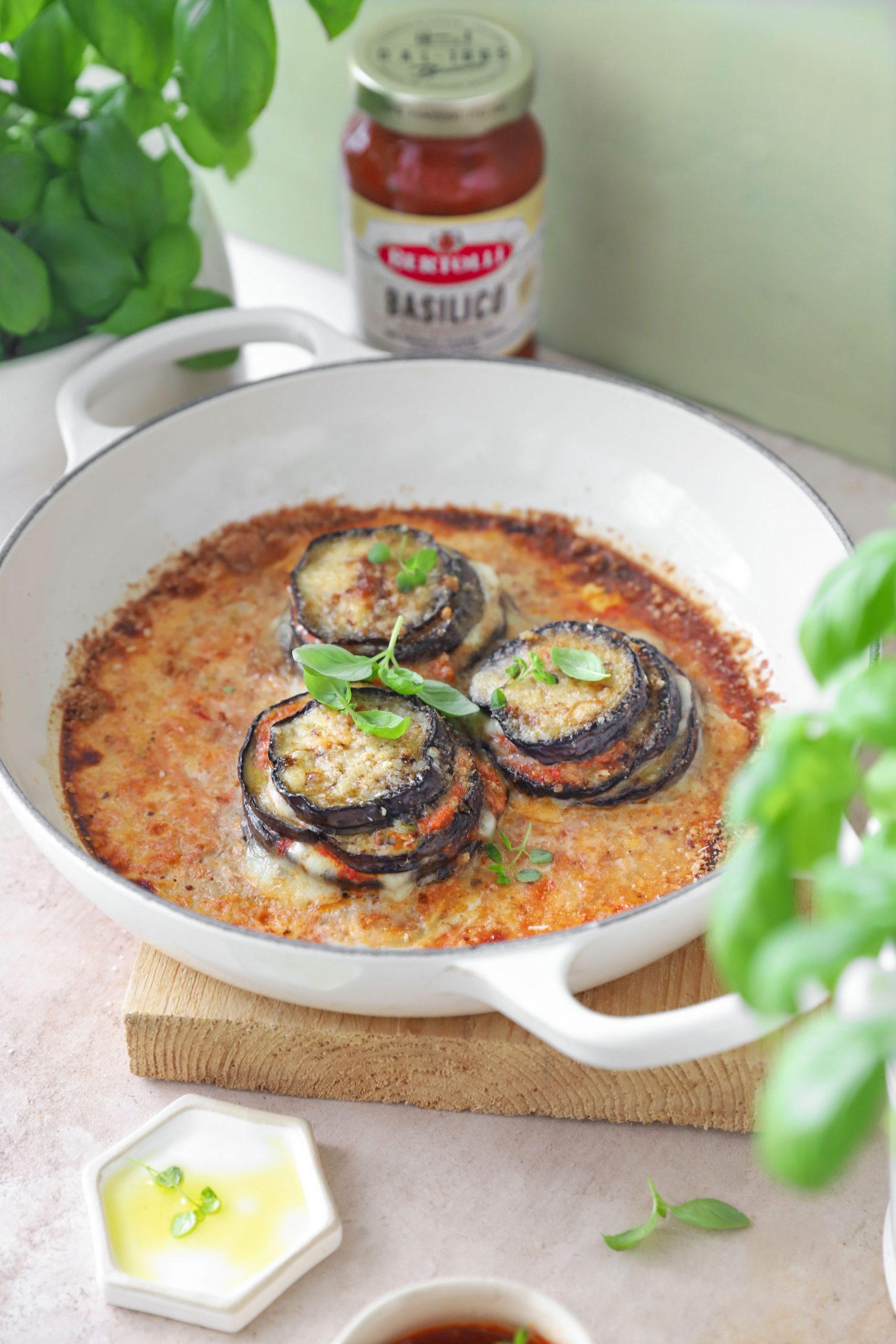 Giet een laag Bertolli Basilico pastasaus in een ovenschaal en leg daar bovenop de aubergineplakjes naast elkaar in de schaal. Verdeel de eiersaus over de aubergine laag en leg daarop wat geplukte mozzarella en een basilicumblaadje. Lepel er dan de rest van de Basilico pastasaus overheen.
