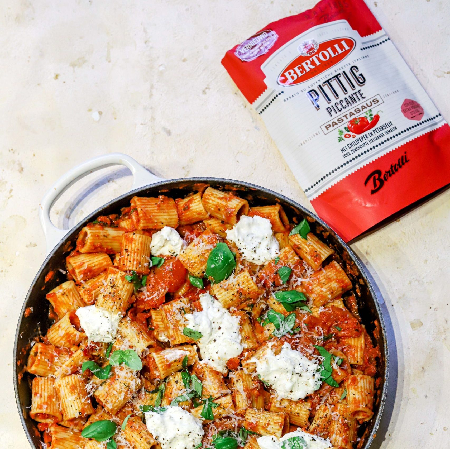 - Kook ondertussen de pasta, let op bewaar een kopje pasta water! Voeg de Bertolli pesto arrabbiata toe aan de tomaatjes en ook de Bertolli piccante pastasaus.
