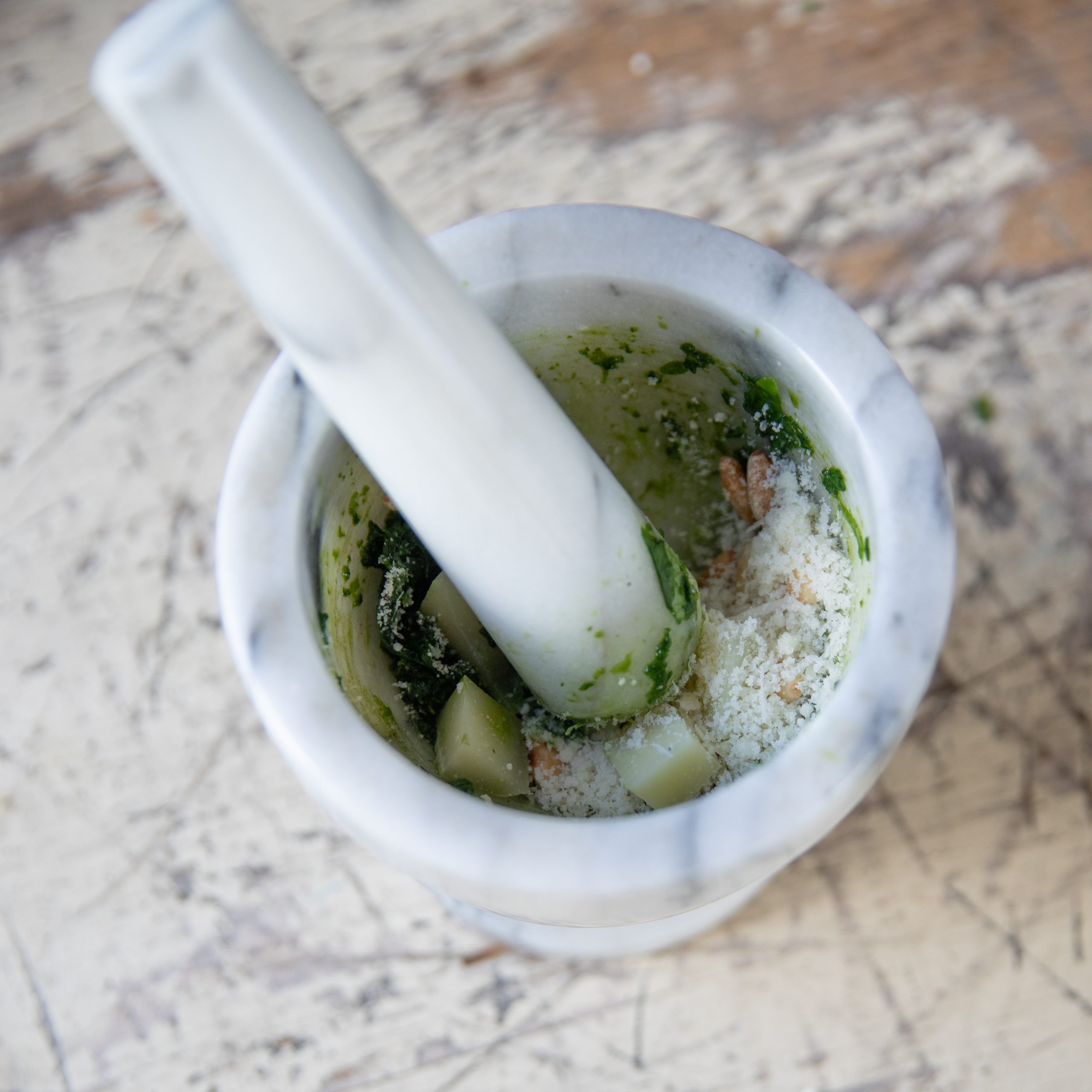 Pesto betekent letterlijk in het Italiaans stampen (pestare). Het is eigenlijk een techniek om gerechten met een soort van crème basis te maken. In zuid-Italië gebruiken ze dezelfde techniek om bijvoorbeeld een pesto van gedroogde tomaat te maken. Vandaag gaan we een Pesto alla Genovese maken op traditionele manier met hier en daar wat aanpassingen van chef Fabio. Dit is de pesto die het meest bekend is en in principe is het een basis van basilicum en een beetje kaas.