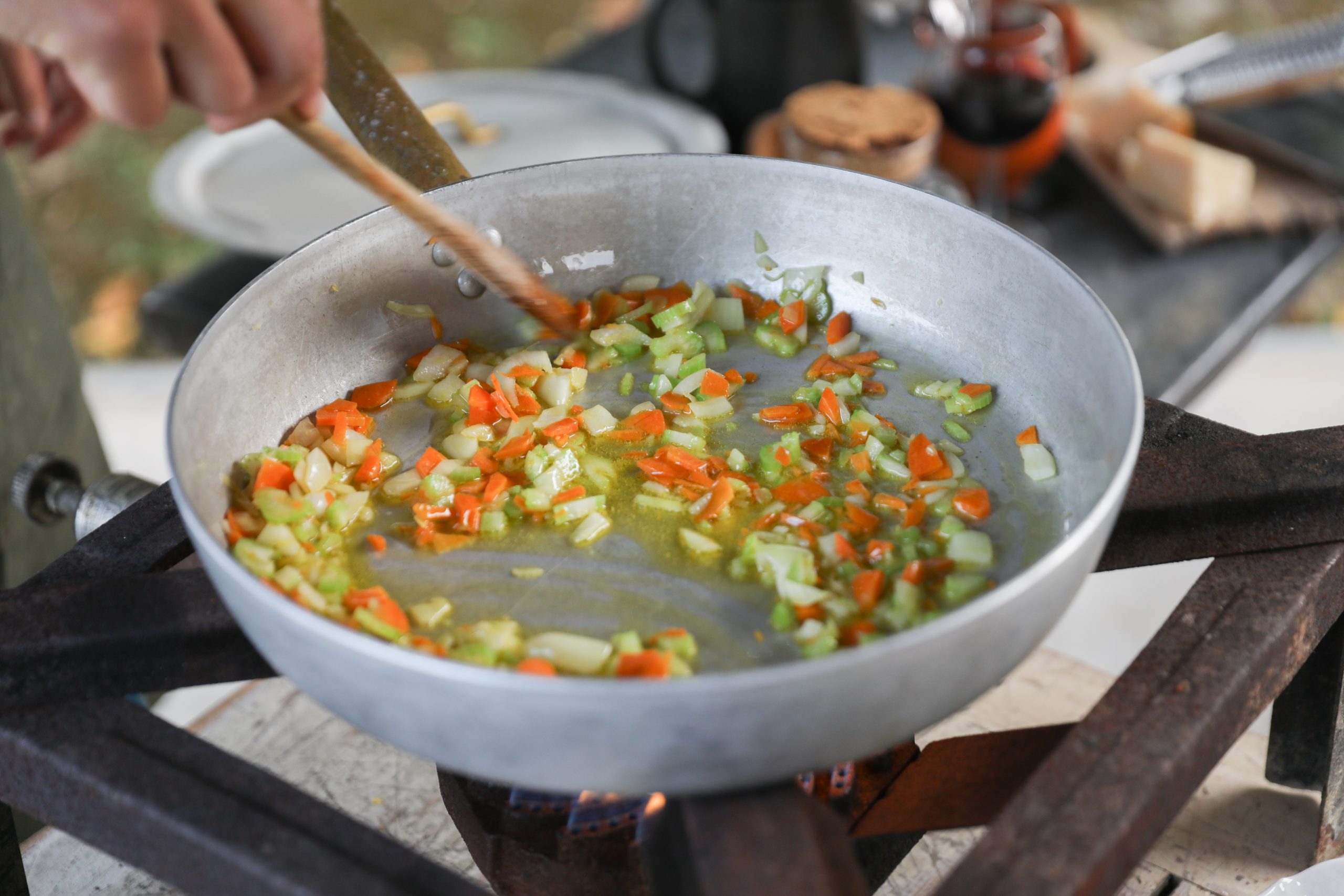 - Warm je pan op met goede Italiaanse extra vergine olijfolie. Doe alle gesneden stukjes groenten tegelijk in de pan en doe de geraspte groentes er later in. Roer voor 4 minuten en laat het bakken. Doe de geraspte groentes er nu bij en blijf nog 1 / 2 minuten roeren.